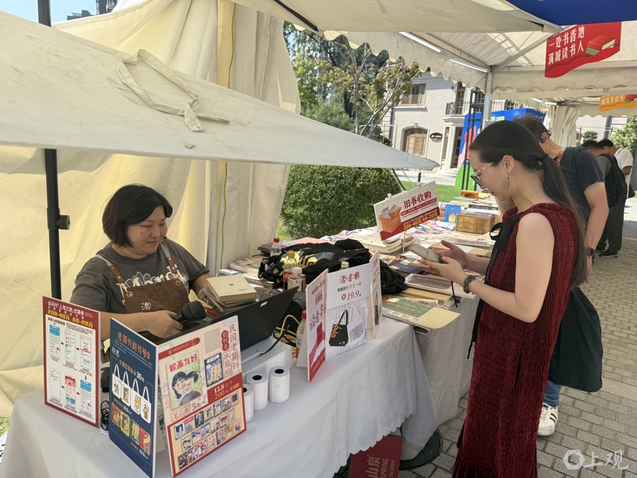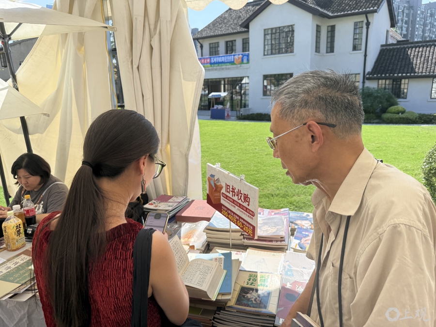 10月11日,上海暑热未退,开张第一天的2025上海书展“旧书新知·淘书乐”苏河华政湾旧书市集迎来新老书友。用小丽的话来说,“爱看书的也许‘i人’(内向型性格特质)多,但有时也渴望交流、分享。不过,就算只是点点头、交换一个眼神,也知道和对方同频共振,这种感觉真好!”一抬头,她望见角落里的工作人员,“我是古籍书店三楼的”,书店员工和书友很快认出彼此,又是一段会心一笑的邂逅。